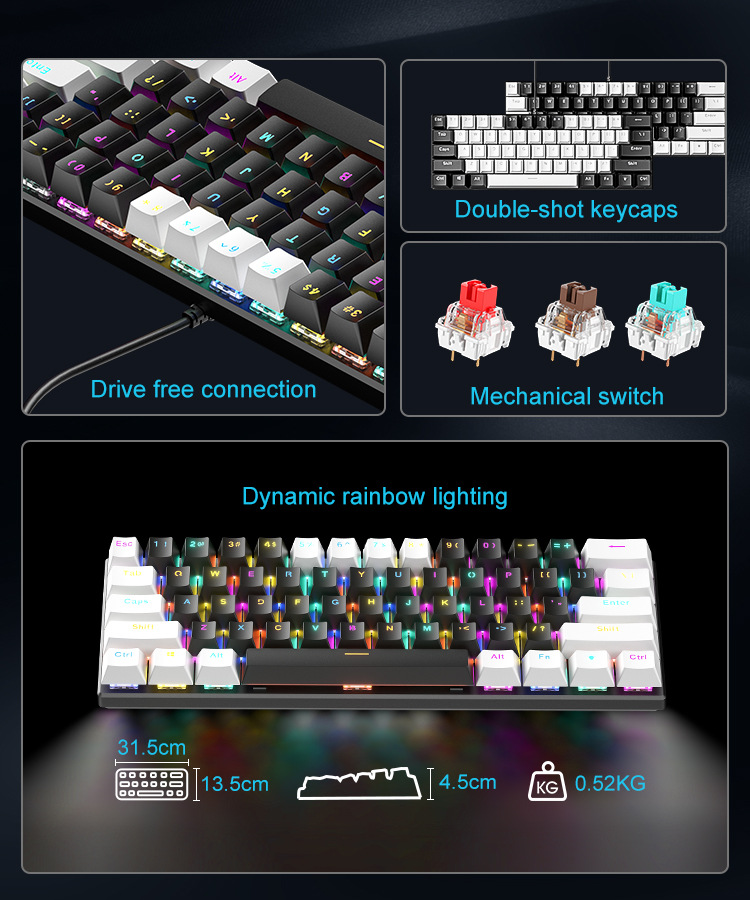 Mechanical Switches: Features high-quality green/red/tea axis mechanical switches for precise tactile feedback.