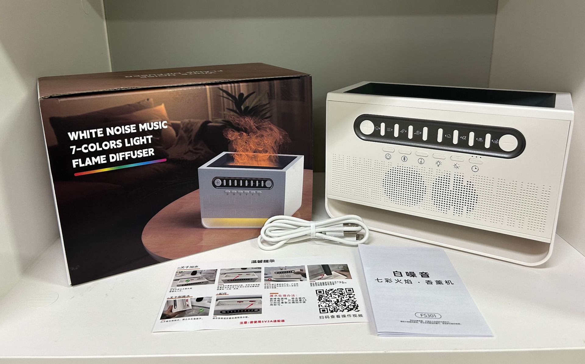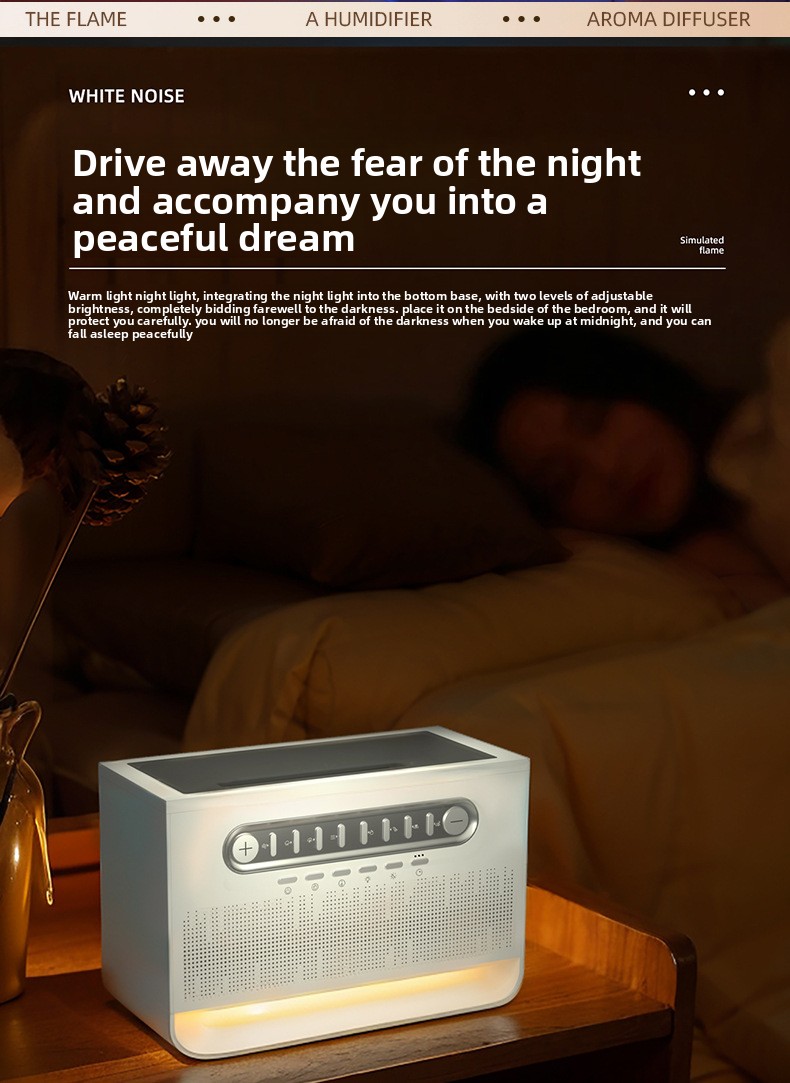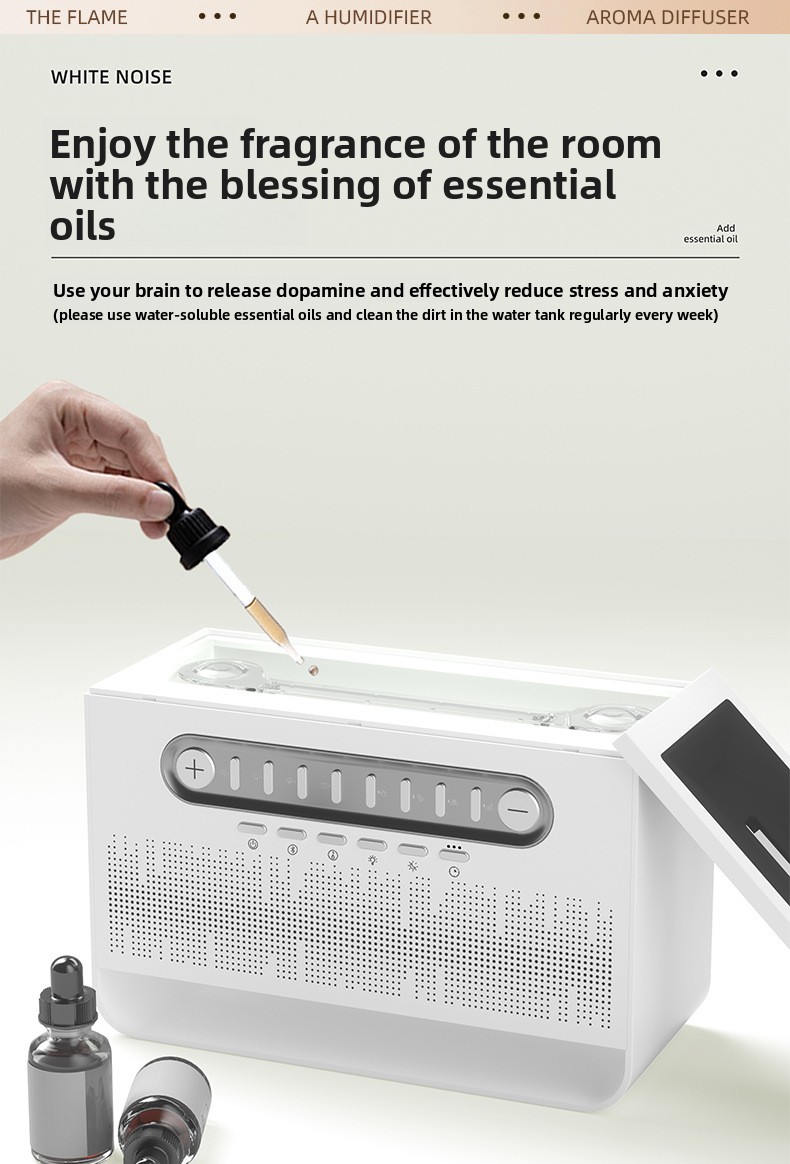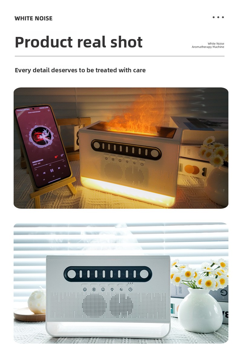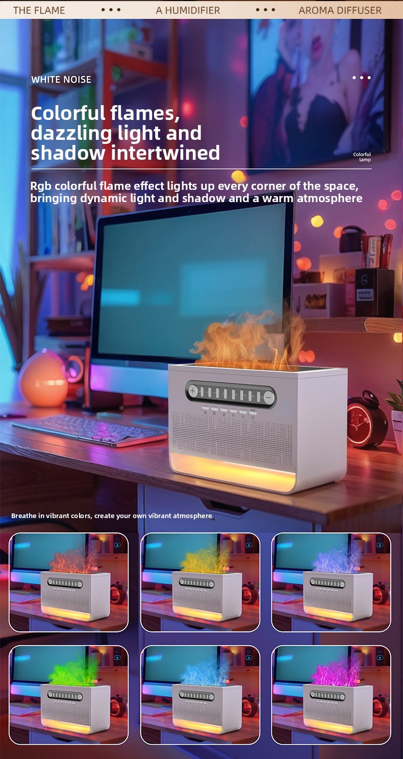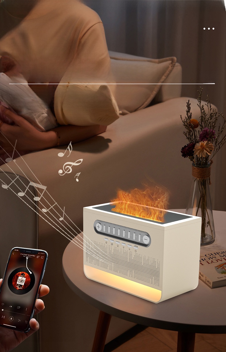 Multifunctional Device: Combines Bluetooth speaker, white noise generator, colorful flame display, and aromatherapy humidifier in one sleek design.