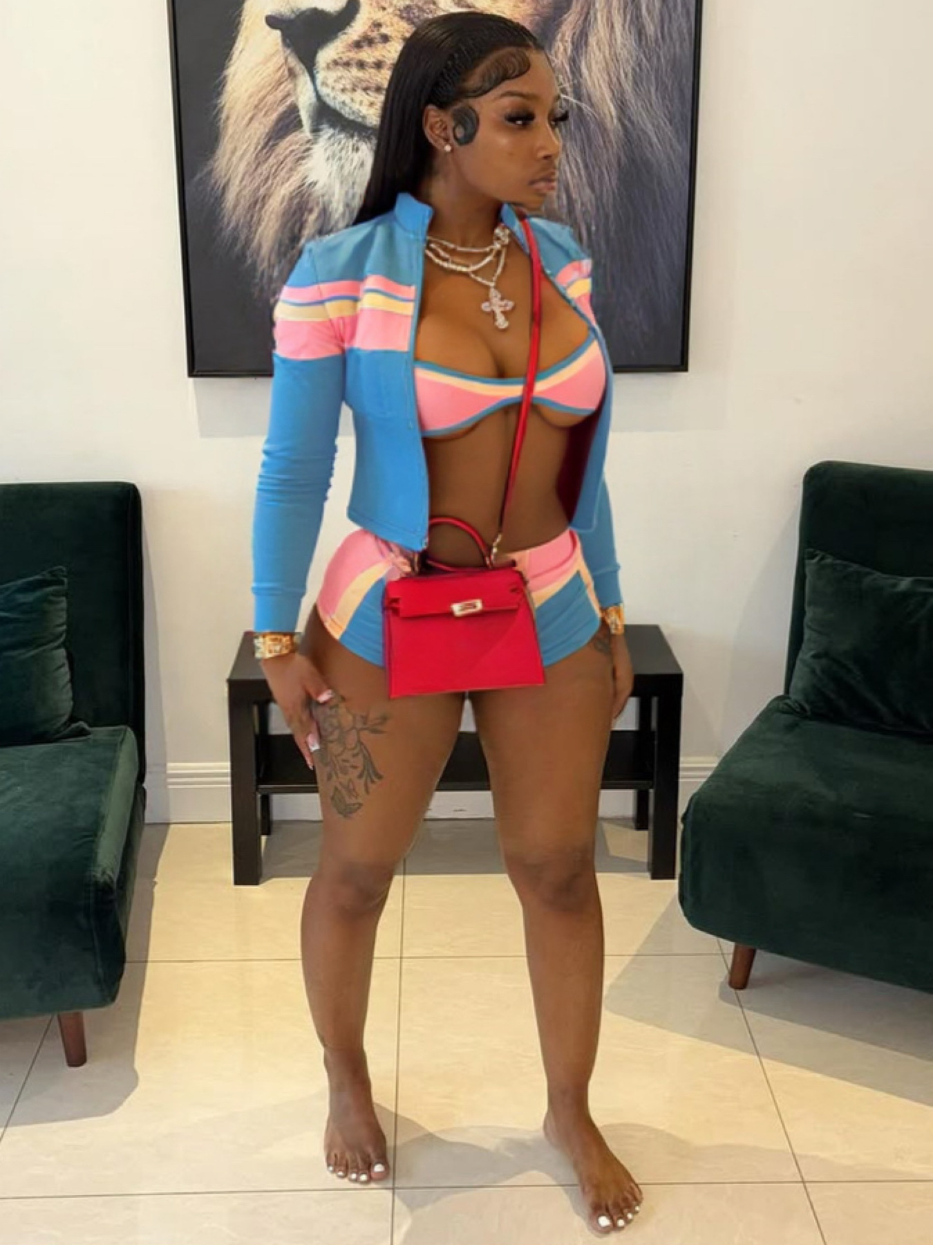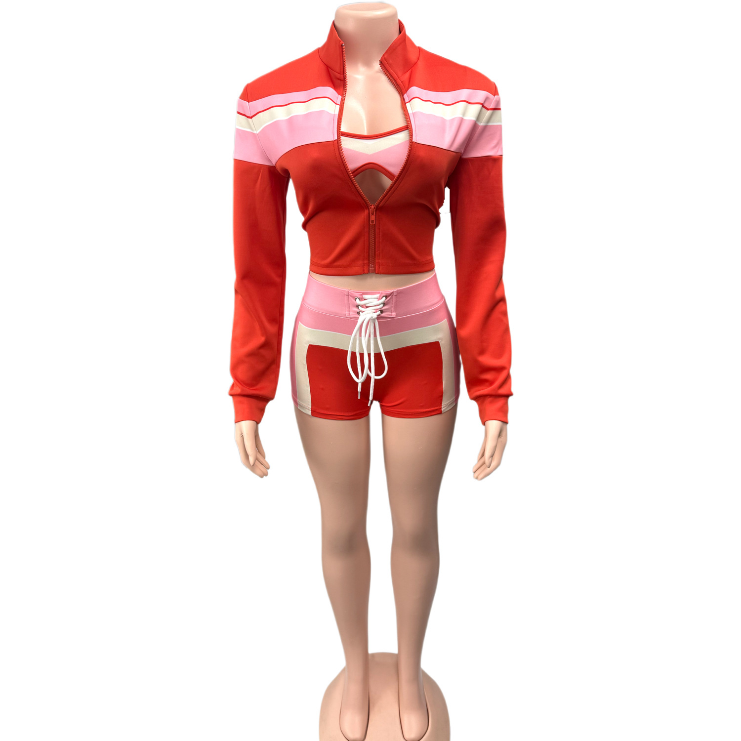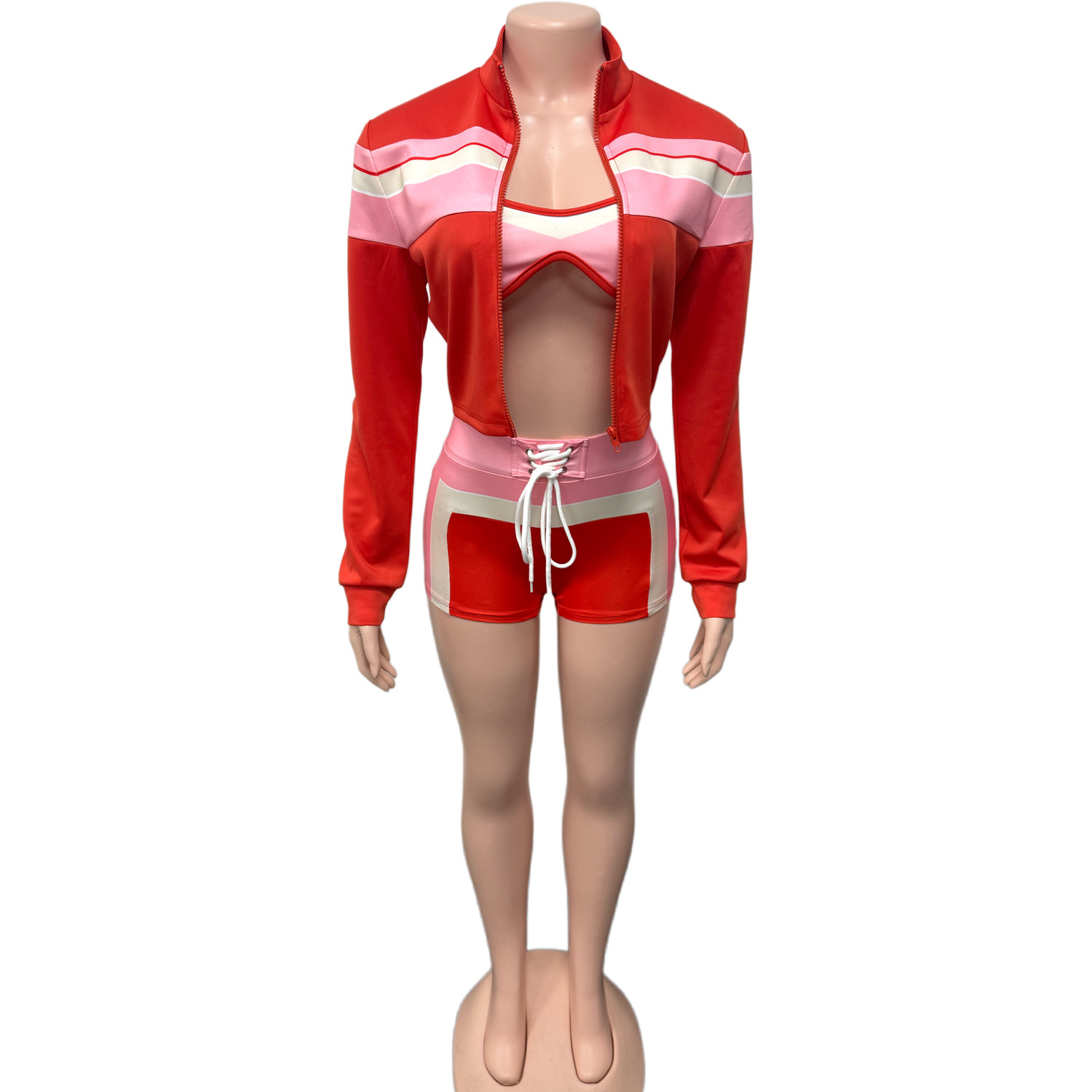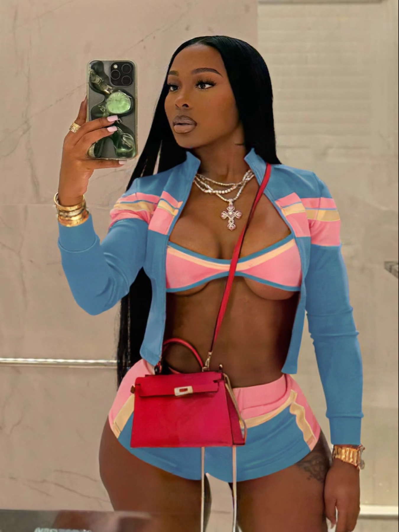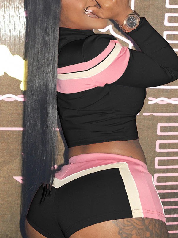 Three-Piece Set: Includes a long-sleeved top, banded hot pants, and a chest-wrap style element.