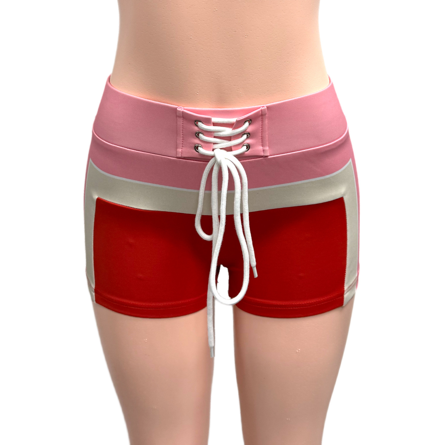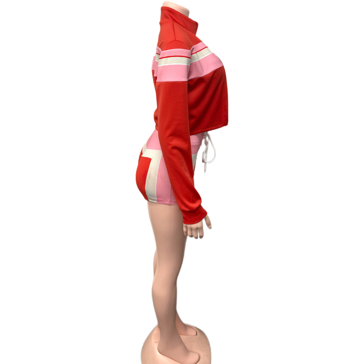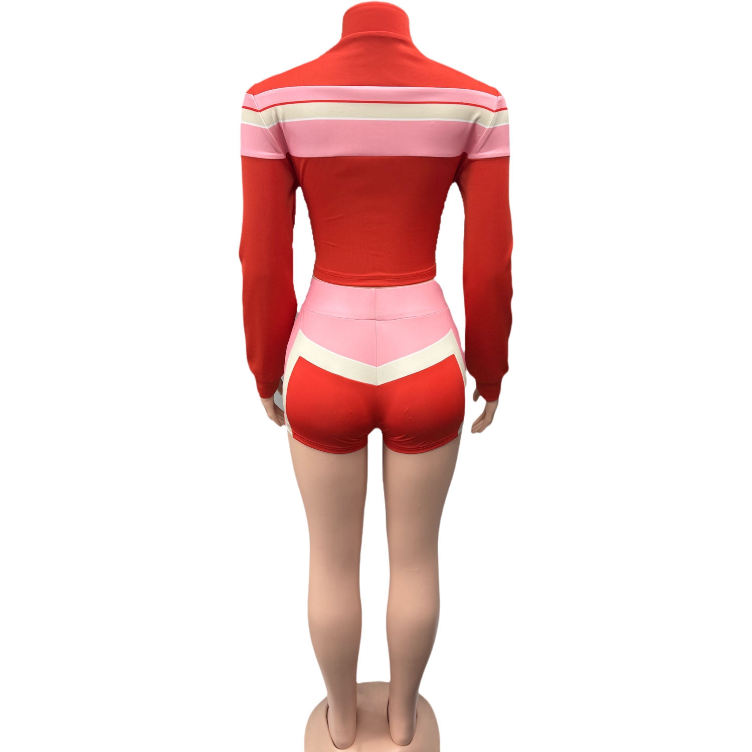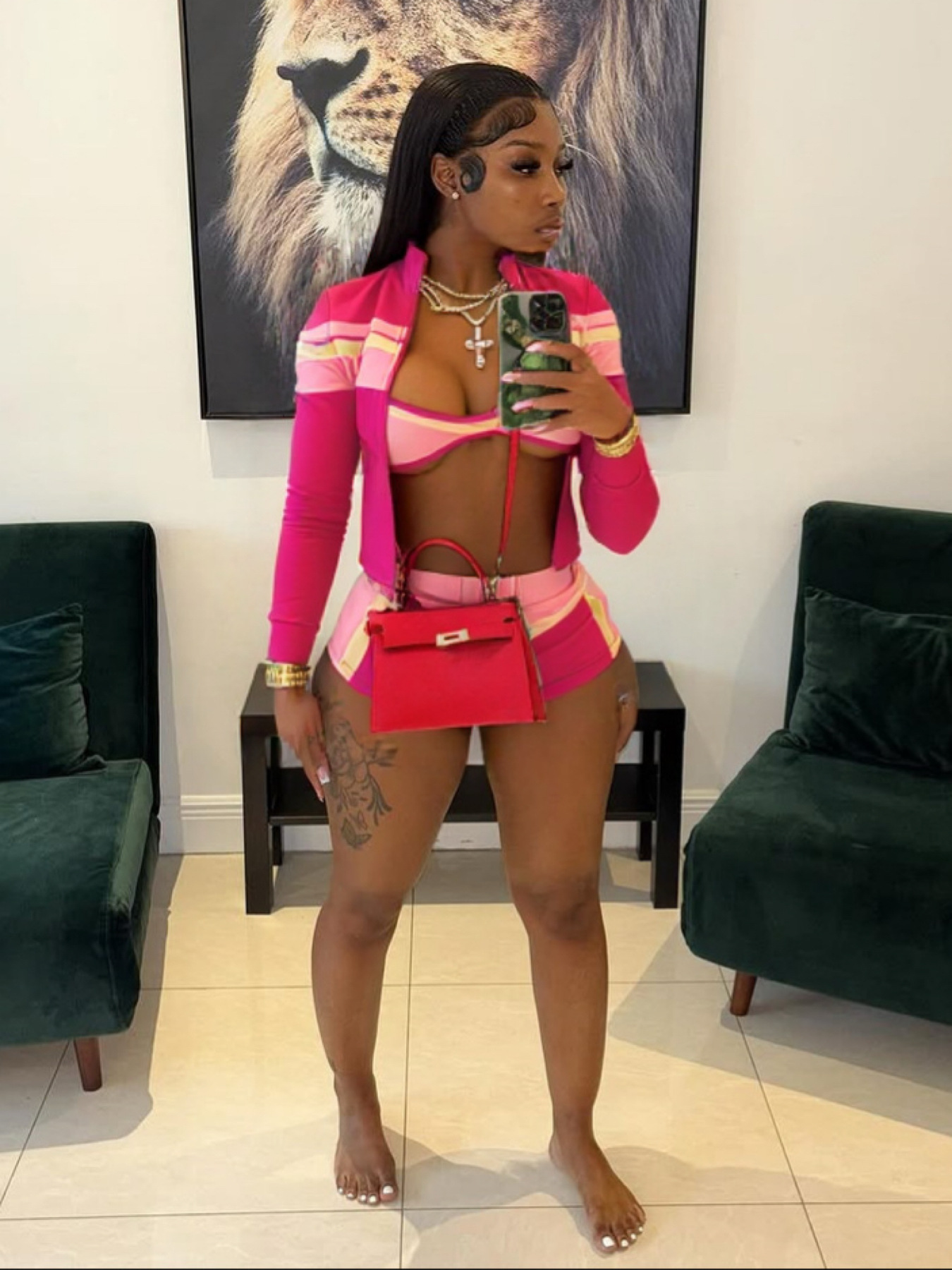 Three-Piece Set: Includes a long-sleeved top, banded hot pants, and a chest-wrap style element.